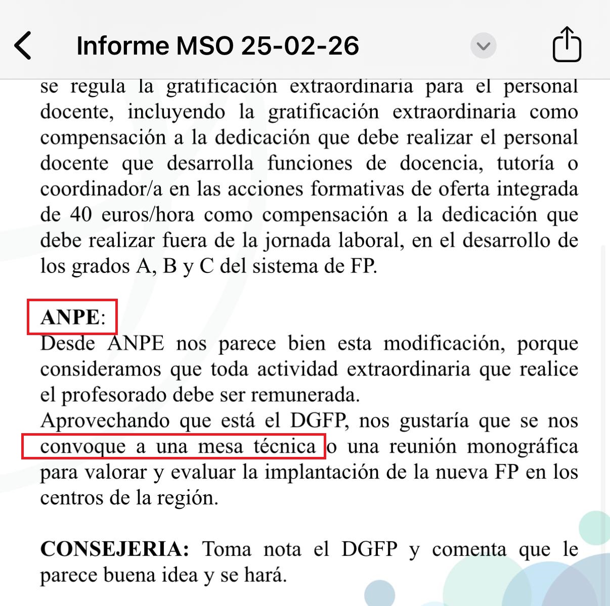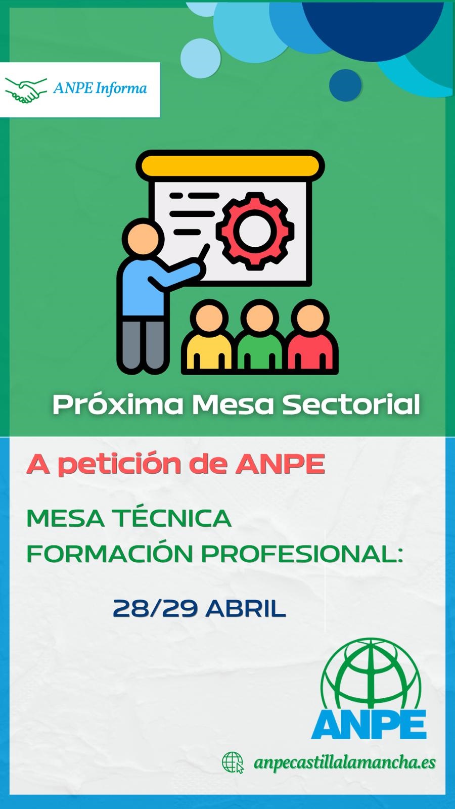 Como ANPE viene demandado en Mesas Sectoriales Ordinarias y Extraordinarias anteriores, y se puede comprobar con imágenes adjuntas - petición de ANPECLM en Informe Mesa Sectorial de 25-03-2026 en punto Borrador de la Orden de la Consejería de Educación, Cultura y Deportes, por la que se modifica la Orden 201/2024, de 28 de noviembre, de la Consejería de Educación, Cultura y Deportes, por la que se regula la evaluación, promoción, titulación y certificación académica del alumnado matriculado en los grados D y E de Formación Profesional en Castilla-La Mancha - Ver aquí propuestas de ANPECLM en Informe. la necesidad de convocar una mesa técnica específica de Formación Profesional para abordar de manera integral los aspectos relacionados con estas enseñanzas