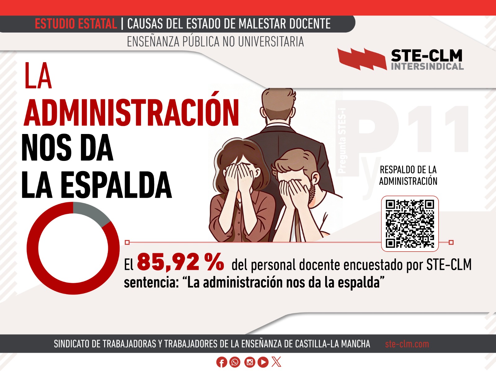 El 85,92 % de los docentes encuestados por STE-CLM sentencian: “la Administración nos da la espalda”. Existe una falta de preocupación por nuestras necesidades reales. Cuando sufrimos problemas de convivencia o conductas disruptivas, en lugar de ofrecer recursos, se opta por culpabilizar a la víctima, cuestionando nuestras competencias pedagógicas. El resultado es un colectivo sumido en el hastío y la indefensión, que teme pedir auxilio para no ser tachado de incompetente.