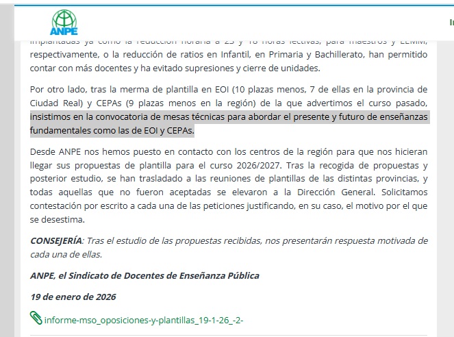 Tras las insistentes peticiones de ANPE-CLM sobre una mesa sectorial concreta sobre situación de CEPAS la Consejería nos ha convocado finalmente. Volvemos a reiterar nuesta petición sobre una mesa técnica sobre situación de EOI's.