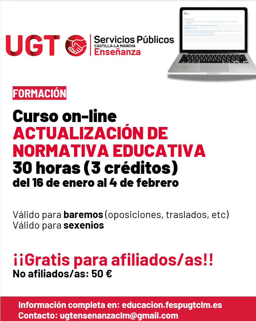 El Sector de Enseñanza de UGT Servicios Públicos Castilla-La Mancha organiza el curso “Actualización de normativa educativa”, homologado por la Consejería de Educación, Cultura y Deportes de Castilla-La Mancha, con las siguientes características: