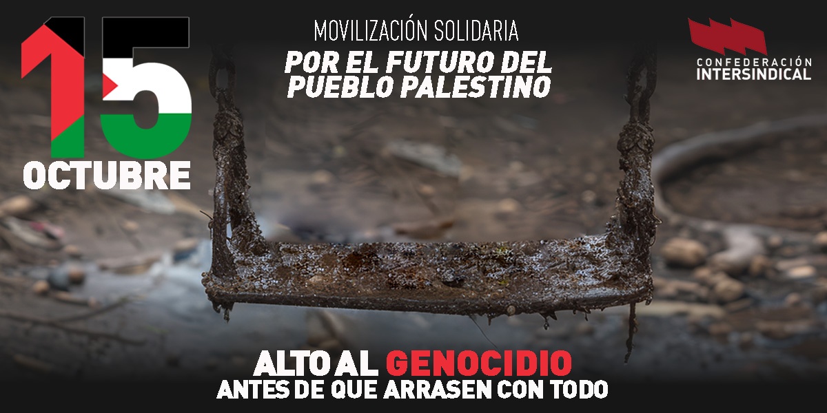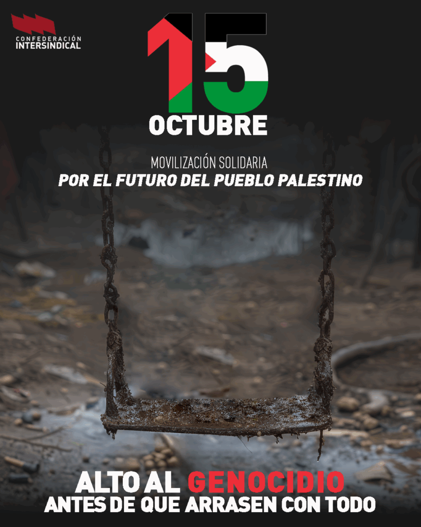 Desde la Confederación Intersindical (CI), organización de clase, internacionalista, formada por diferentes Intersindicales territoriales y sindicatos sectoriales del Estado Español llamamos a redoblar la movilización en estas semanas críticas. Los pasos políticos que llevan a reconocer el estado de Palestina, son torpes y tardíos. Hay que imponer sanciones duras a los genocidas. Detener la guerra es parar el genocidio. Nos movilizamos para sumarnos a diferentes iniciativas en marcha en estos momentos: Marea Palestina, defensa de La Flotilla que busca romper el aislamiento de Gaza entregando medicinas y alimentos para la población, impulsamos diferentes movilizaciones que culminarán con la convocatoria de una movilización en los centros de trabajo el próximo día 15 de octubre. Todo ello dentro de un horizonte marcado por una huelga, el arma más importante que tiene la clase trabajadora.
