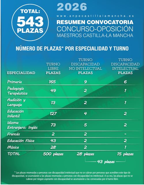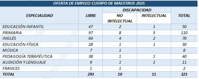 - 321 plazas de Maestros que, sumadas a las 222 plazas de la OEP de 2024 resultan las 543 plazas que se convocan a oposición de Maestros, cuyas pruebas se iniciarán en junio de 2026.
