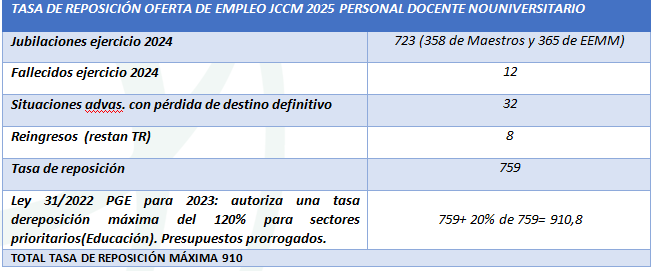 CONSEJERÍA:La Oferta que presentan deriva del Acuerdo de Mejoras firmado por ANPE y UGT con la Consejería de Educación, que en su punto octavo recoge la aprobación de esta oferta, al máximo de lo establecido en la normativa.La Ley de Presupuestos autoriza una tasa de reposición (jubilaciones, fallecimientos, pérdida de destino,…) máxima del 120% por sectores prioritarios (Educación), y en cumplimiento del acuerdo de Mejoras se alcanza ese porcentaje,incrementando la oferta en 151 plazas y resultando: