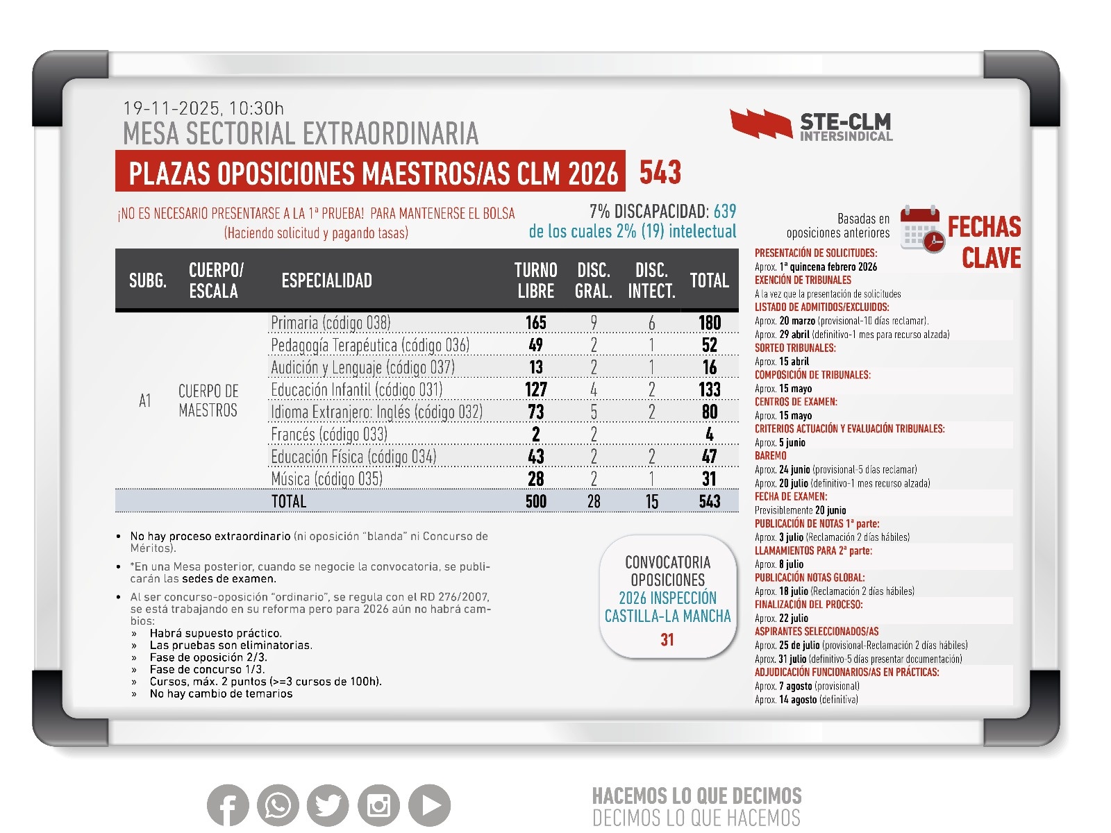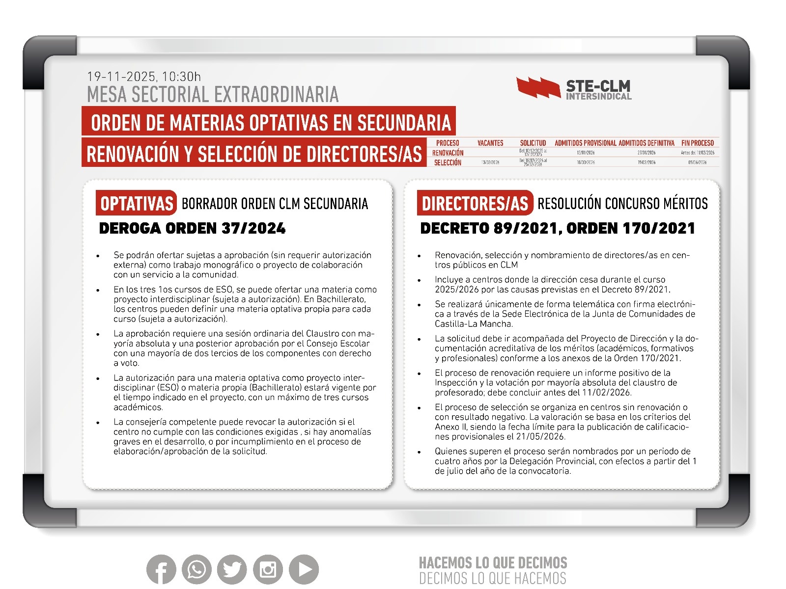 Finalizada la Mesa extraordinaria de educación sobre OEP 2025 y Oposiciones de Maestros/as en CLM para 2026, la Renovación y selección directores/as y la Orden de Optativas de Secundaria, desde STE-CLM te informamos de lo más relevante y nuestras reivindicaciones: