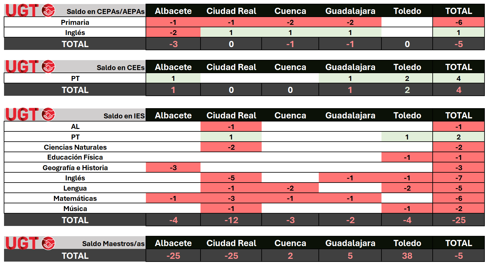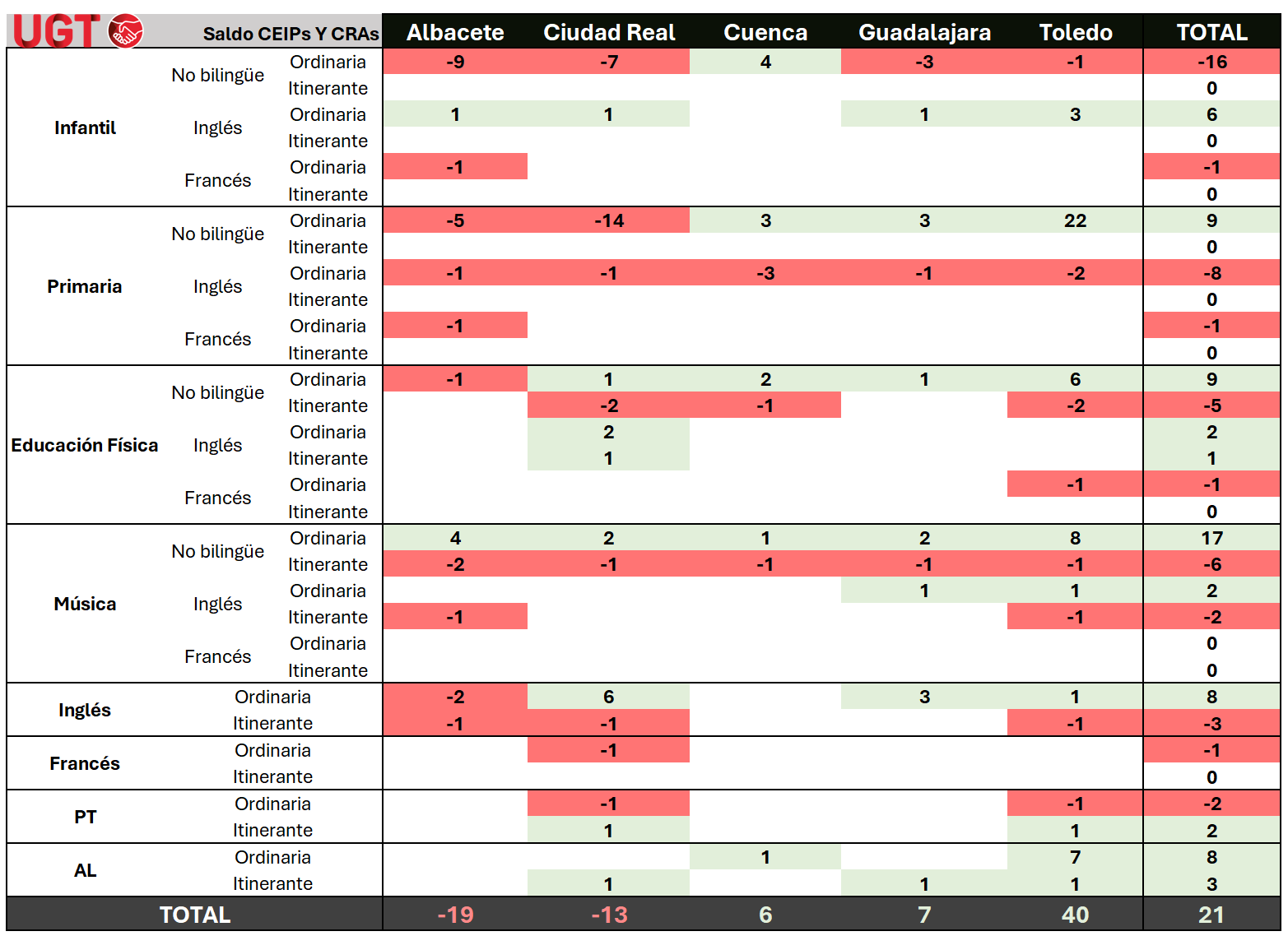 En CEIPs y CRAs, aumentarían en 21 plazas, si bien las plazas totales disminuyen en Albacete (-19) y Ciudad Real (-13), y el aumento se produce fundamentalmente en Toledo (+40). Las especialidad peor...UGT Enseñanza