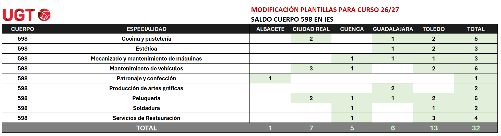 - Un saldo positivo de 32 plazas más del cuerpo 598