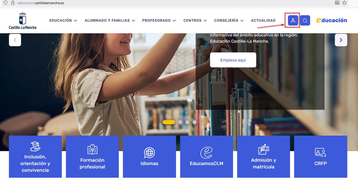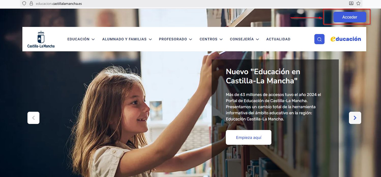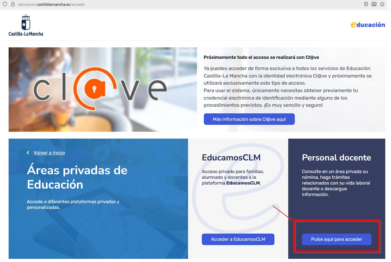 1. Acceder al nuevo portal de educación de Castilla - La Mancha: https://educacion.castillalamancha.es/ . Hacer click en "Acceder" o en el icono de "usuario" ambos elementos nos llevarán al inicio del login del portal del personal docente: